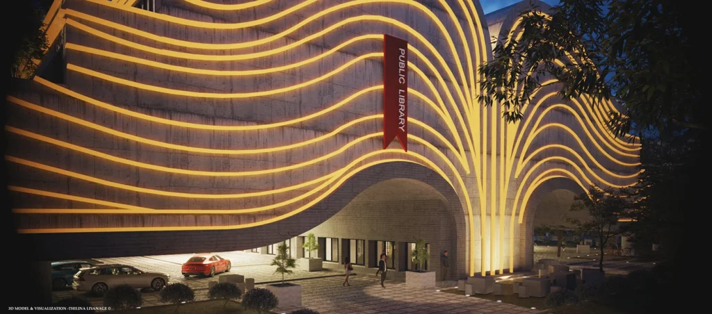 Some libraries try to attract bookworms. This one commits to the metaphor so completely that walking inside feels like stepping between pages. Thilina Liyanage’s Public Library‘s exterior mimics an open book mid-read, with two curved structures meeting at a spine, their forms arching upward like paper caught in a breeze. Floor-to-ceiling glass panels stretch across both halves, flooding the interior with natural light that shifts throughout the day, casting reading nooks into soft afternoon glow or sharp morning clarity depending on where the sun sits.