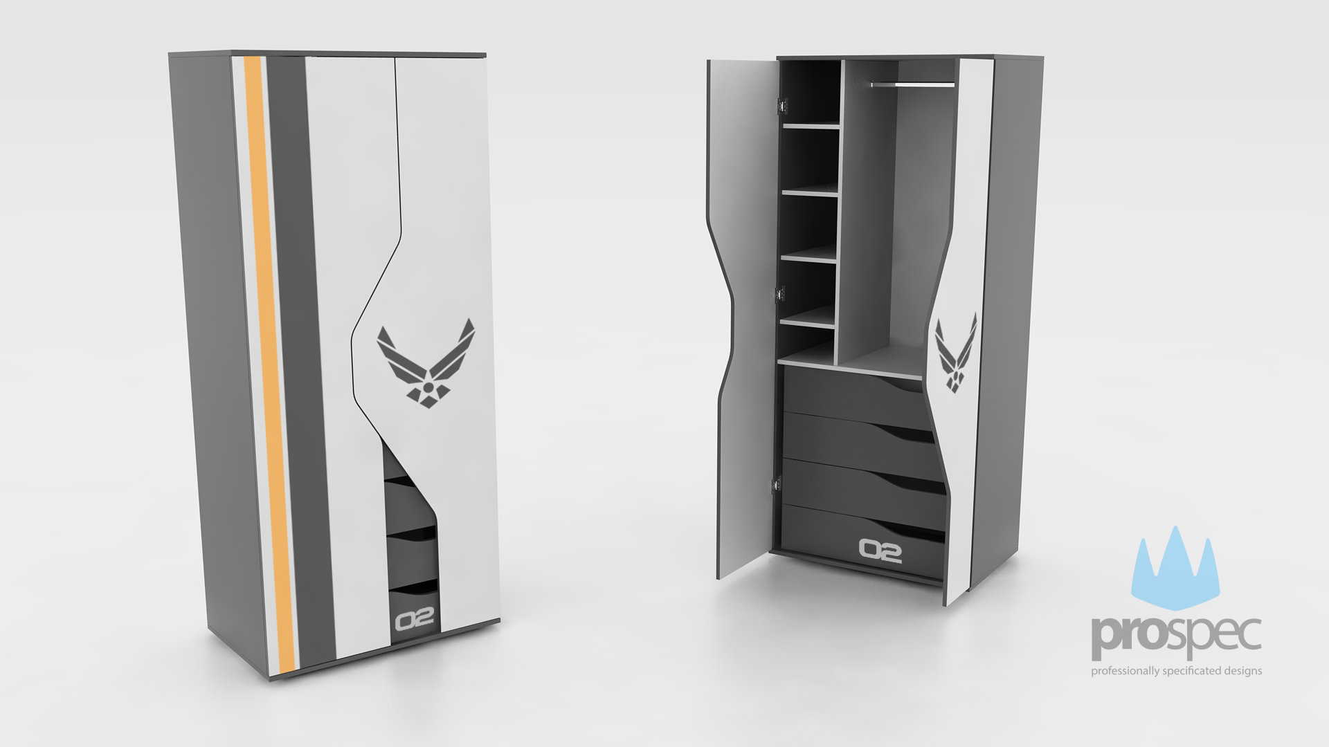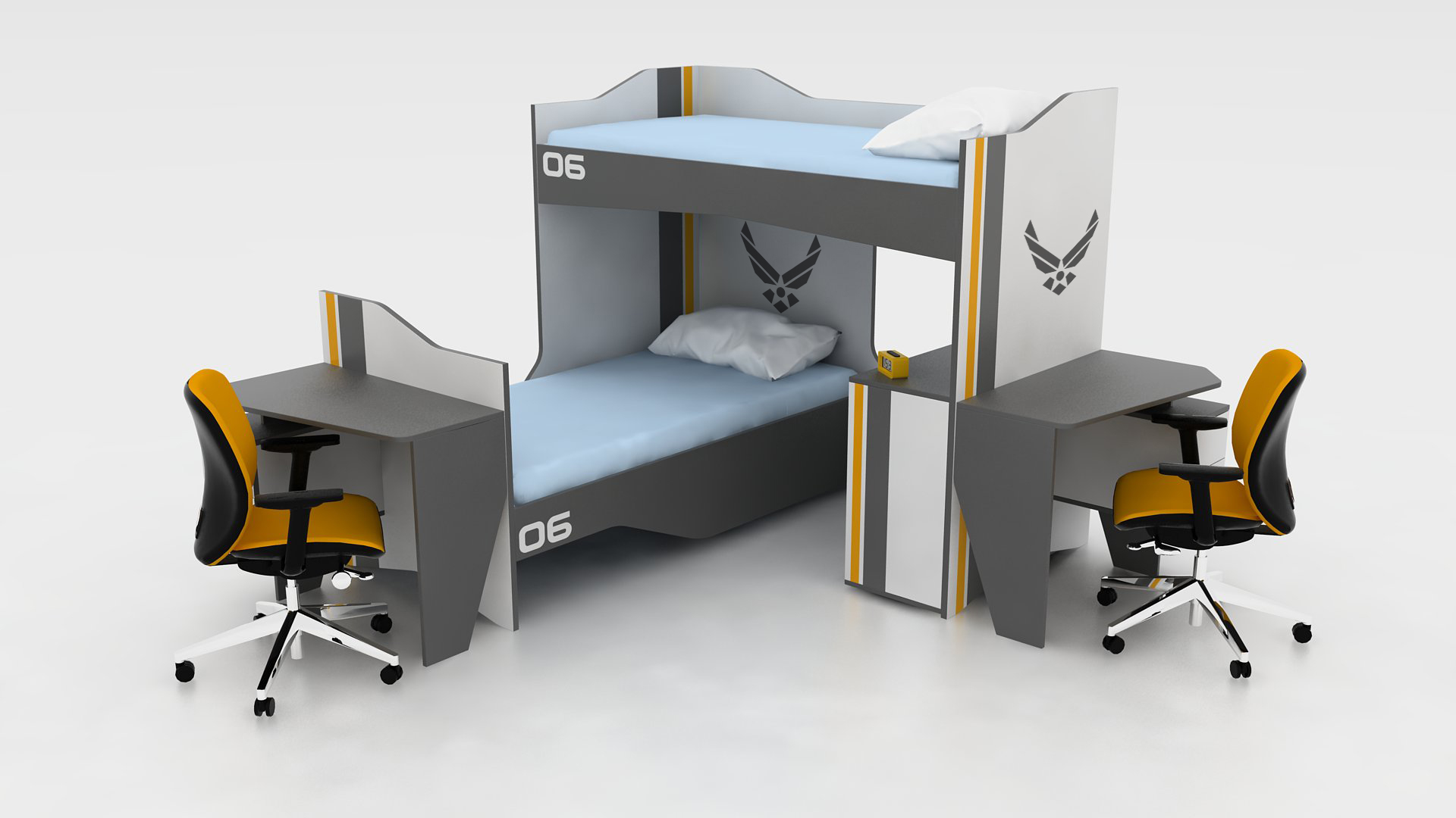 This child-furniture collection includes a single bed and a bunk bed option, a study desk, a nightstand and a spacious wardrobe, all sharing the same angular silhouettes, cut‑out details and emblem graphics. Furthermore, each piece of the Traune Set, is designed with dynamic, almost spacecraft‑like profiles that give the room a futuristic, adventure-ready atmosphere, encouraging imagination and play as much as study and rest.